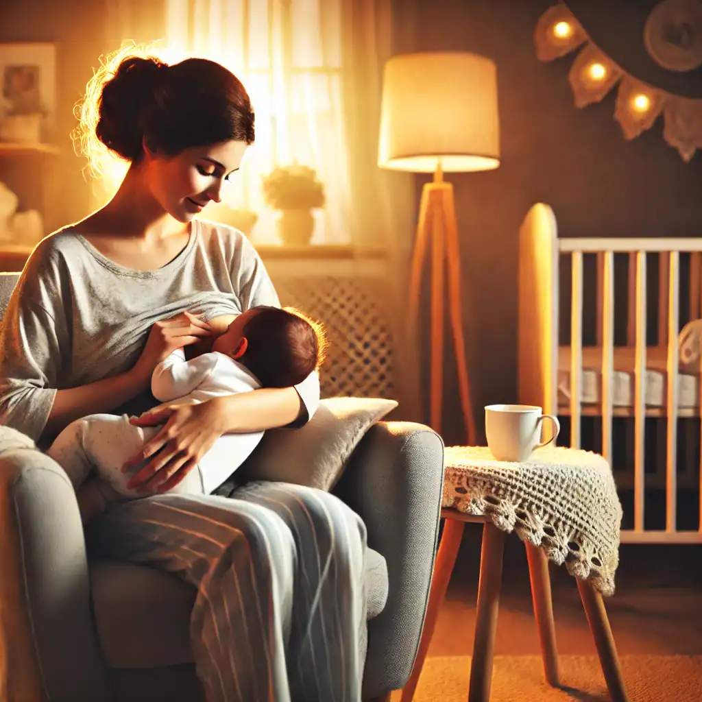 Una madre amamantando a su bebé en una cómoda silla, en una habitación cálida y acogedora con luz suave, rodeada de artículos para bebé.